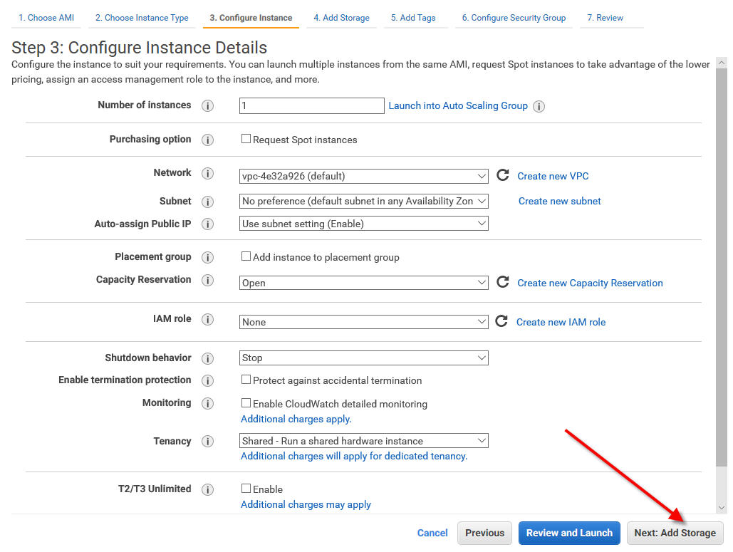 Accept the defaults or modify below to your environment (for example, set the VPC to one you currently have):