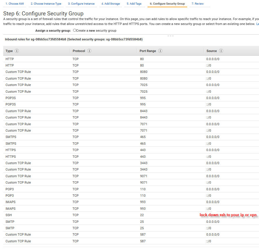 The following steps will guide you through setting up a Zimbra server on an AWS instance. We sized our Sandbox as a t2.medium instance, even though the minimum requirements are for 8GB of ram. For production systems, choose a t2.large instance. We created it using a root disk of 10GB and an encrypted 20GB disk for /opt. Disk space really depends on the volume of email in your organization. You will also need an elastic IP as well as MX records in DNS. Create a security group and add the ports needed for Zimbra.