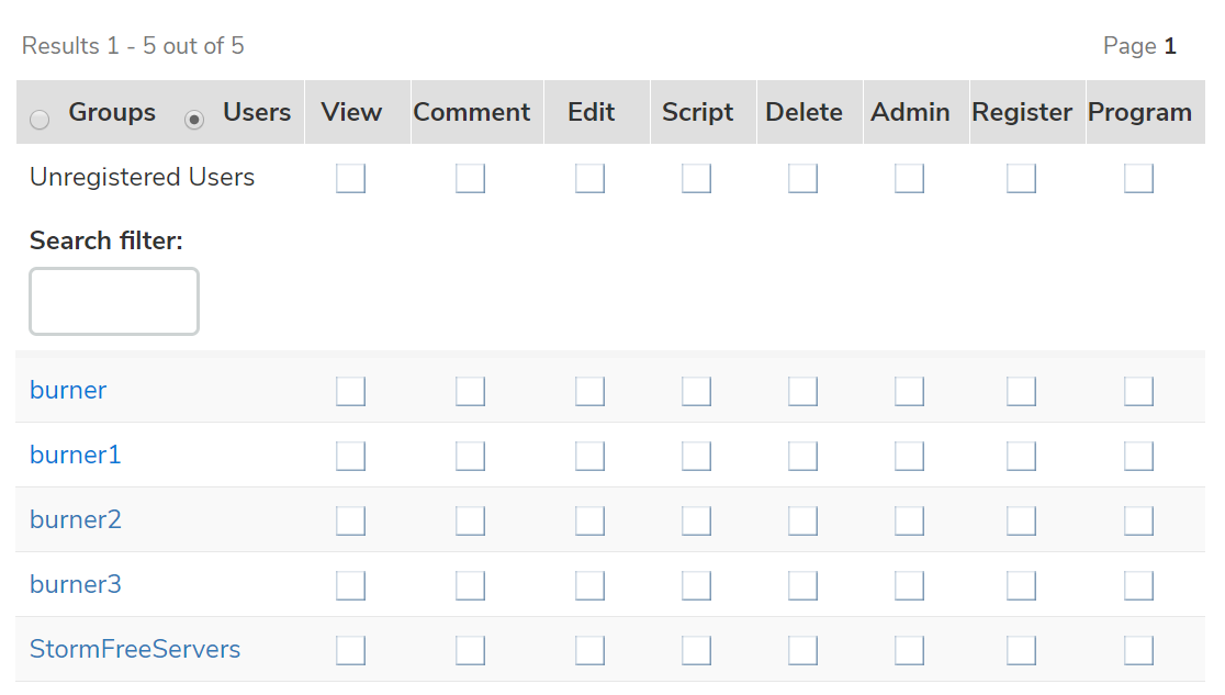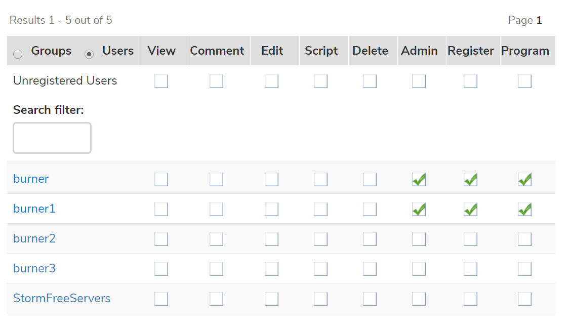 Figure 2: In the above example, burner and burner1 have been granted permissions, which has implicitly denied those rights to all other users, since their boxes remain blank