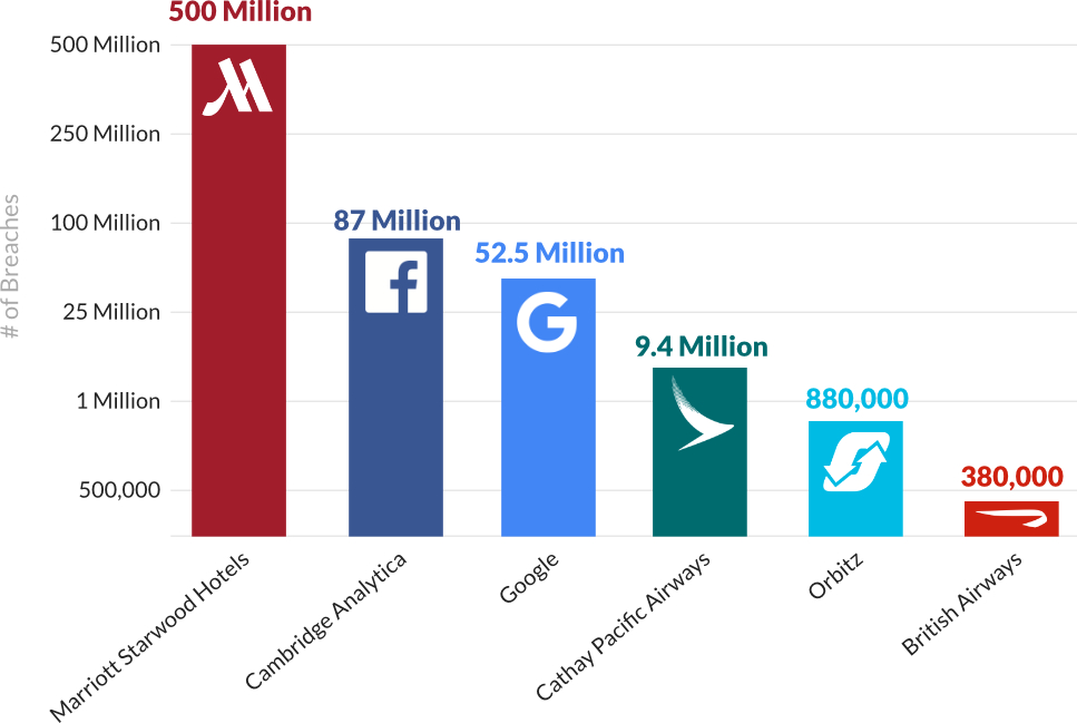 Listed as one of the largest breaches of the year, Marriott Starwood Hotels was targeted by hackers stealing the information of 500 million guests. Google revealed it had a series of data breaches that exposed the private information of 52.5 million of its users. Facebook informed the public of a security issue where the private profiles of almost 50 million user accounts were accessed, this was in addition to news that third-party company, Cambridge Analytica, had been collecting user data. Orbitz, British Airways, and Cathay Pacific all had breaches of their booking systems affecting over 10.6 million travellers. The largest breach of 2018 was a data leak of India's government identification database affecting 1.1 billion citizens. And this is only a few from 2018. Back in 2017, Equifax reluctantly reported a breach of its credit report database exposing highly sensitive data, including personal, credit, and banking information of 148 million people.